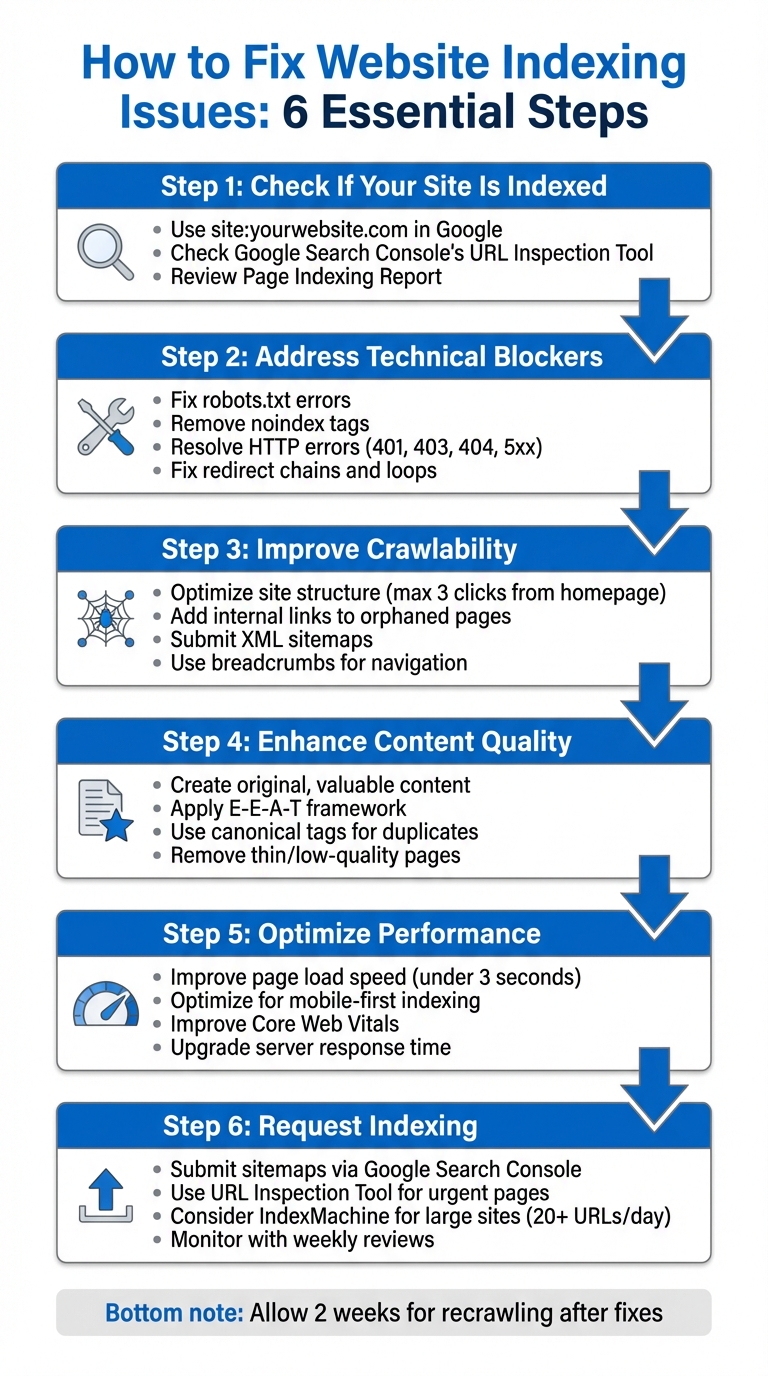site:yourwebsite.comin Google or Google Search Console's URL Inspection Tool. - Address technical blockers: Fix robots.txt errors, noindex tags, HTTP errors, and redirect issues.